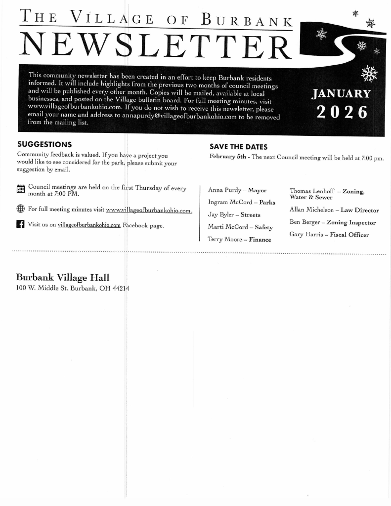 If you would like to be added or removed from the newsletter mailing list, please email your name and address to annapurdy@villageofburbankohio.com.