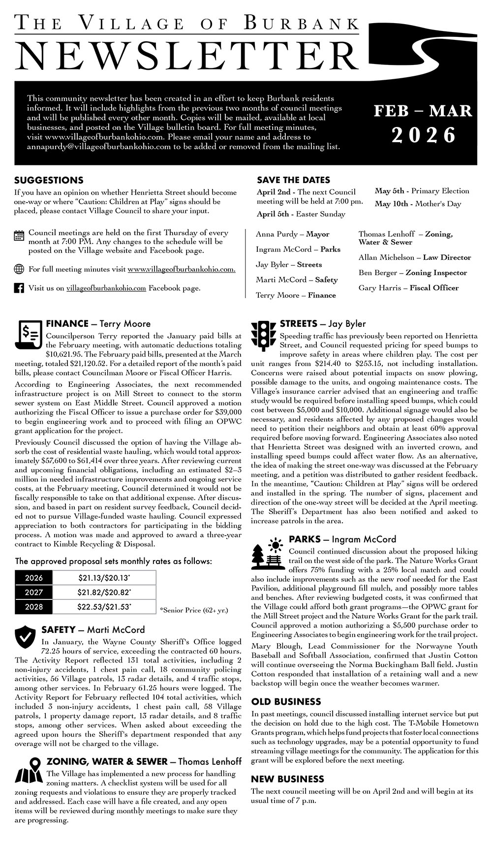 If you would like to be added or removed from the newsletter mailing list, please email your name and address to annapurdy@villageofburbankohio.com.